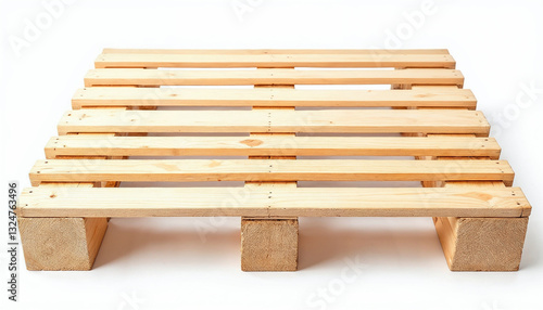A wooden pallet on a white background, the pallet is made of light-colored wood and has a simple design, with several planks running horizontally and supported by blocks underneath