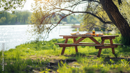 A wooden picnic table and bench, full of treats and drinks, situated in a sunny, green meadow.
