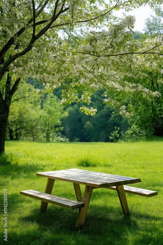 A wooden picnic table sits in a lush green field. The table is empty, and the surrounding area is filled with trees and grass. Concept of tranquility and relaxation