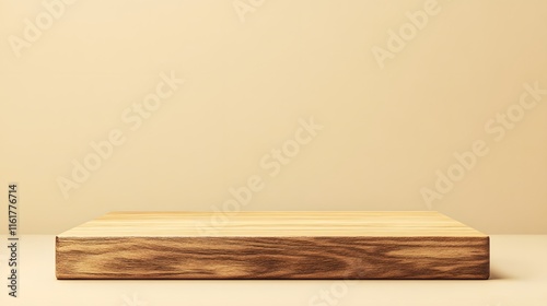 A wooden podium with a natural grain texture, featuring a spacious, empty display area, against a warm beige background.