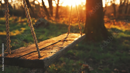 A wooden swing hangs from a tree, illuminated by the warm glow of a sunset, surrounded by lush greenery.