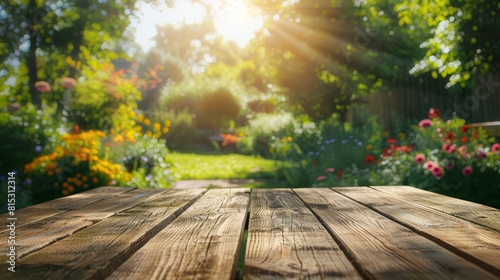 A wooden table in a garden, illuminated by sunlight filtering through trees with a blurred background, copy space