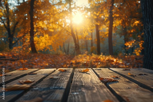 A wooden table surrounded by trees in a dense forest