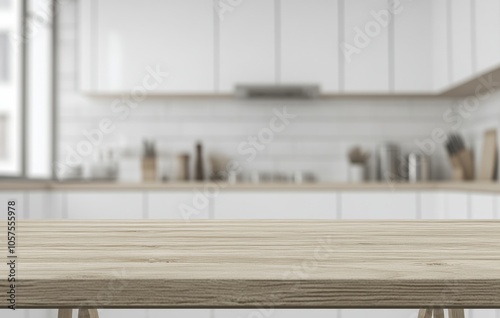 A wooden table with a kitchen in the background. There are knives and spoons on the table