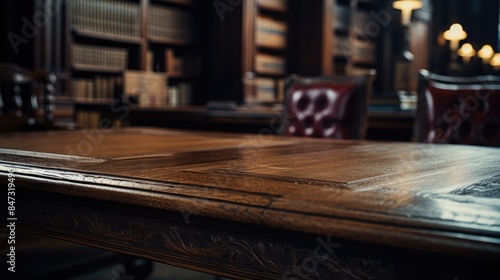 A wooden table with a red chair positioned in front, ideal for use in interior design or furniture sales