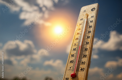 A wooden thermometer with the sun shining in the background, a red ball on top of it showing high temperature.