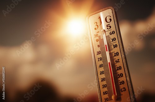 A wooden thermometer with the sun shining in the background, a red ball on top of it showing high temperature.