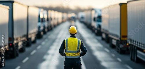 A worker in a safety vest and hard hat standing between rows of trucks in a transportation hub, observing the operations.