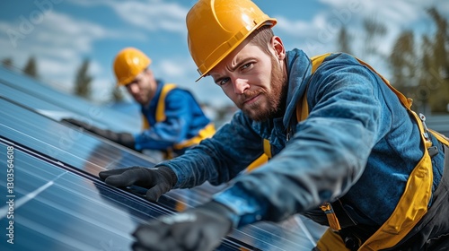 A worker in a yellow helmet and safety gear installs solar panels on a roof, with a colleague working in the background.