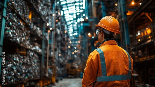 A worker in a yellow jacket stands in a large industrial building