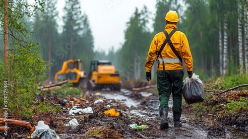 A worker in a yellow jacket walks through a muddy forested area, with machinery in the background, indicating logging activity.
