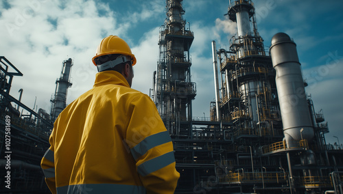 A worker in a yellow safety suit and helmet is standing near an oil and gas industry plant with a blue sky background, looking at the ground, viewed from behind.