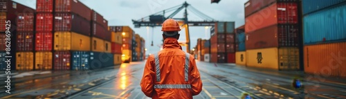 A worker in reflective safety gear stands in front of stacked shipping containers at an industrial port, highlighting logistics and transportation.