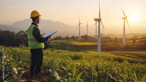 A worker in safety gear inspects a wind farm at sunset, surrounded by lush fields and towering turbines.