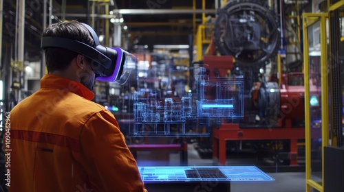 A worker in VR gear interacts with digital data in an industrial setting.