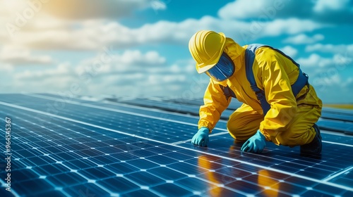 A worker inspects solar panels under a clear sky, emphasizing renewable energy and sustainable technology.