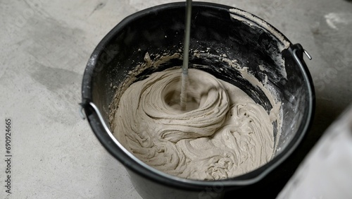 A worker uses an electric cement mixer while mixing mortar liquid in a bucket. Gray solution in a bucket. The mortar glue is mixed in a bucket by a worker. A worker mixes a bucket of gray solution.