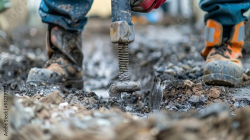 A worker using a jackhammer to break through the hard earth for a new utility line.