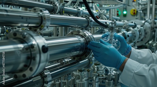 A worker wearing blue gloves carefully inspects the intricate machinery in a factory setting