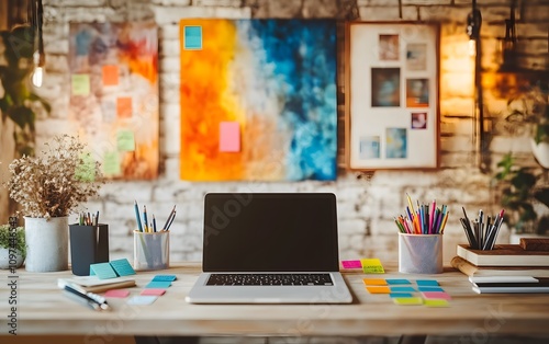 A workspace featuring a laptop, stationery, and colorful sticky notes for creative tasks.
