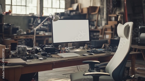 A workspace with a computer, chair, and various tools, suggesting a creative environment.