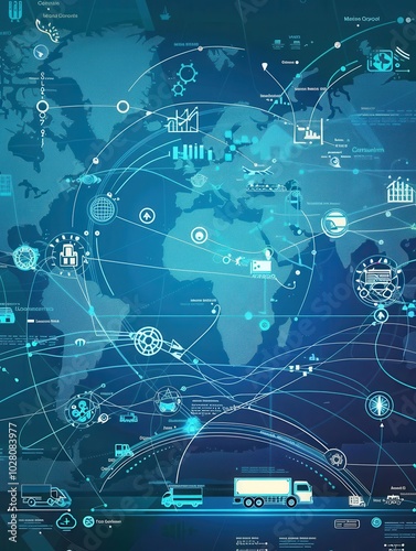 A world map displays global transport routes with icons representing diverse methods of transportation, emphasizing logistical connections. Generative AI