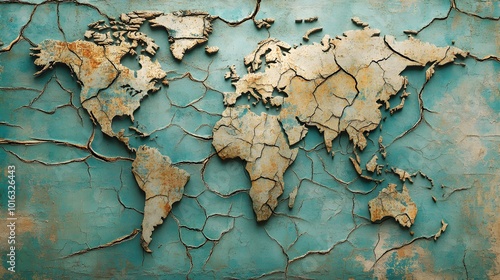 A world map with visible cracks forming between countries, symbolizing broken trade relations and divided trade routes, representing global conflict and economic instability
