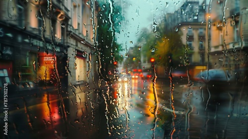 A world transformed by a dreary defocused downpour blurred buildings shiny streets and swaying trees. Amidst it all the inviting glow of a retreat where the sound of rain is drowned .