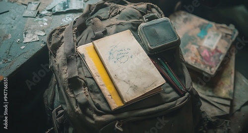 A Worn Backpack with Notebooks, Pens, and a Device