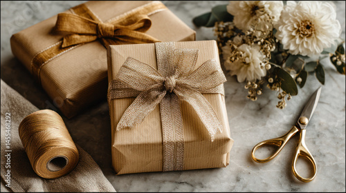 A wrapped gift box with golden ribbon and scissors on marble table with flowers and twine spool, creating warm festive atmosphere