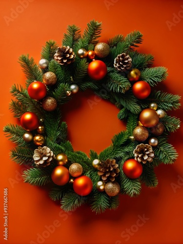 A wreath made of pine needles and gold and orange balls