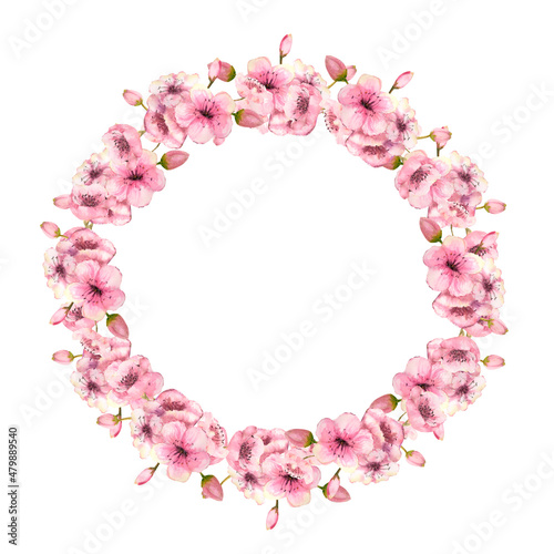A wreath of spring pink sakura blossoms on a white isolated background. Watercolor illustration