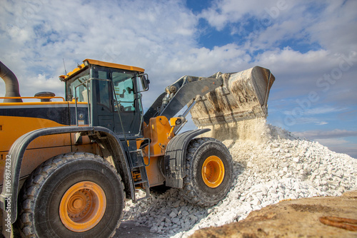a yellow bucket truck dumps white marble chips onto an open warehouse at the wharf. A bucket loader forms a stack