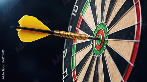 A yellow dart hits the bullseye on a dartboard, symbolizing precision and accuracy in a game of darts.