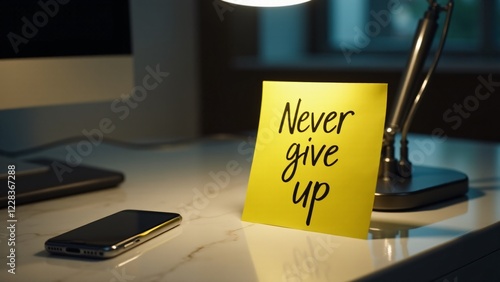 A yellow post-it with "Never give up" on a marble desk, accompanied by a desk lamp and smartphone, inspiring resilience and perseverance.