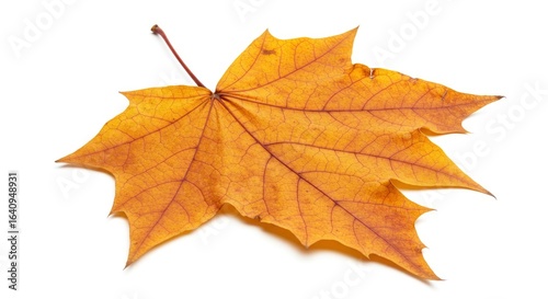 A yelloworange maple leaf lies on a white surface displaying its pointed lobes and prominent veins