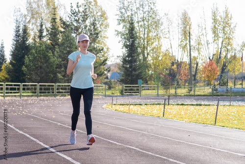 A young beautiful woman in sportswear plays sports at a local stadium. Exercise, jog and exercise at the beginning of the day. Healthy and active lifestyle.