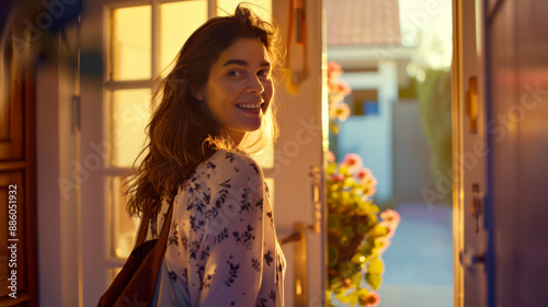 A young beautiful woman with long hair is smiling standing in front of the door. She's wearing a white shirt and a backpack. She's going to work