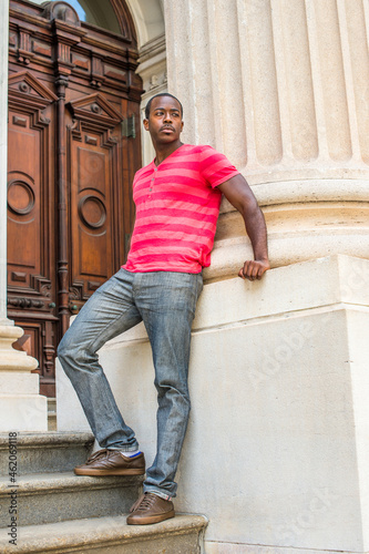A young black graduate student is standing outside an office building on campus, relaxing and thinking.