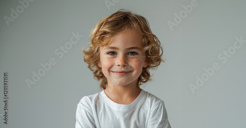 A young blonde child with long hair smiles gently, wearing a white shirt, against a neutral light background. The child’s soft expression and natural look create a warm, calm atmosphere.