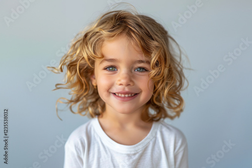 A young blonde child with long hair smiles gently, wearing a white shirt, against a neutral light background. The child’s soft expression and natural look create a warm, calm atmosphere.