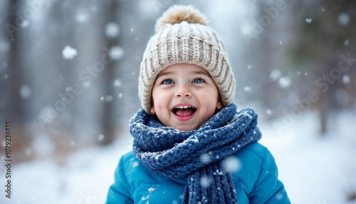 A young boy bundled in a knit hat and scarf, catching snowflakes on his tongue, smiling joyfully in a snowy winter setting.