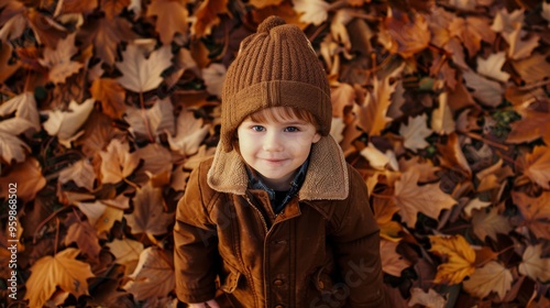 A young boy in a knit hat and cozy jacket stands amid a sea of fallen autumn leaves, looking up with a beaming smile.