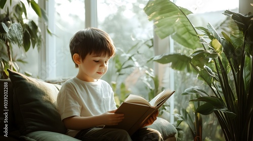 A young boy reads a book in a sunlit room surrounded by lush plants.