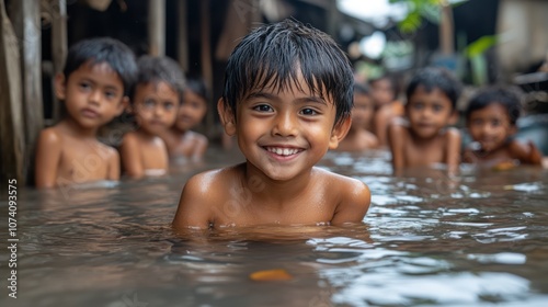 A young boy smiles brightly as he enjoys a swim with his friends in a shallow pool of water.