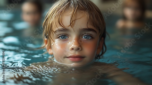 A young boy with blue eyes emerges from the water, looking directly at the camera with a smile.