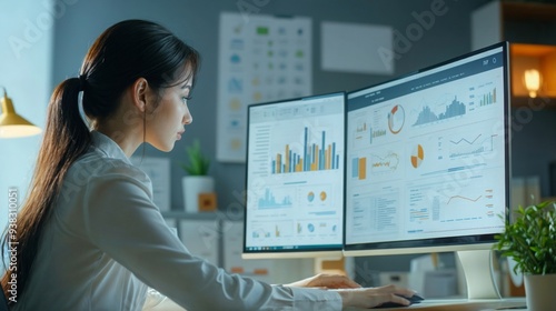 a young businesswoman seated at a desk in a modern office, deeply engrossed in monitoring a large computer screen displaying an array of colorful graphs and charts, suggesting a financial or analytica