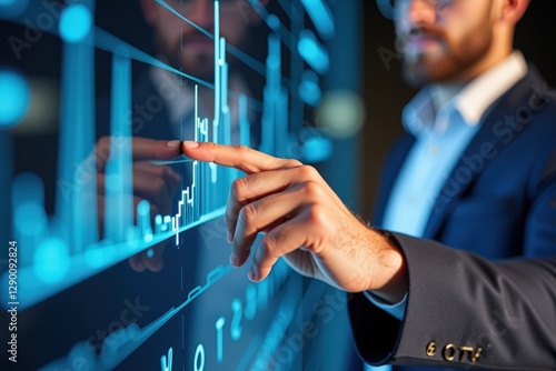 A Young Caucasian Male Financial Analyst Reviewing Digital Market Trends on a High-Tech Screen in a Modern Office Environment with Analytical Charts and Graphs