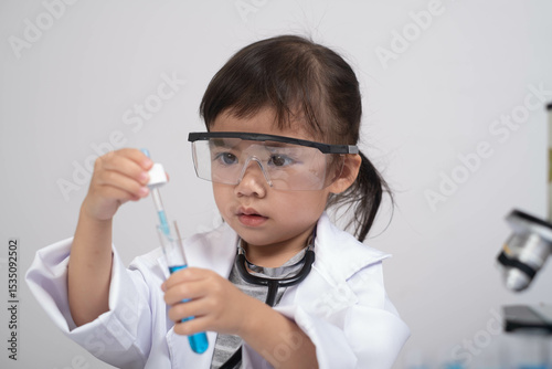 A young child in a lab coat and safety goggles carefully conducts an experiment with a pipette, showcasing an early interest in science.