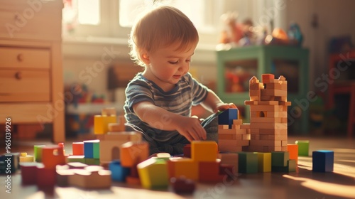 A young child sits on the floor, happily playing with colorful building blocks in a sunlit room.